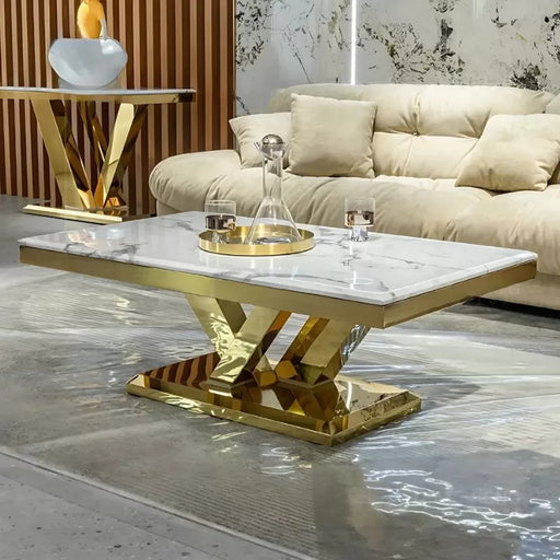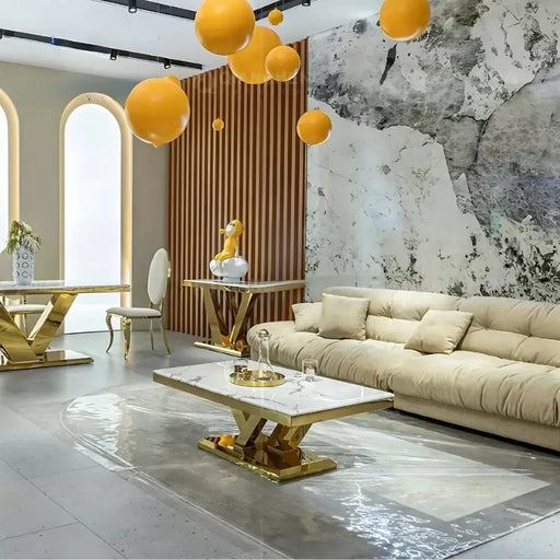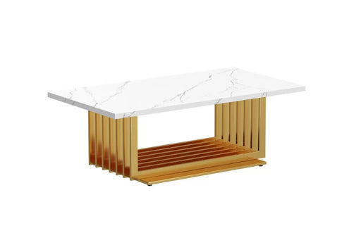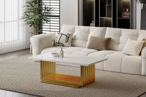 Your Quality Dream FurnitureA thick marble top highlights this lovely Milan Coffee Table. A slatted pedestal base is covered in a gold-finished stainless steel that shines aga...