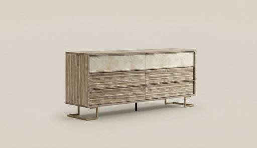 ESFIn stockMade in Italy The Linea Dresser from Arredoclassic features sleek Italian design with ribbed textured fronts, soft neutral tones, and a bronze-fini...