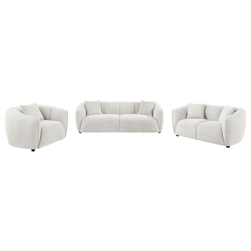 CoasterThree-piece sofa set creates a coordinated living room arrangement with sofa, loveseat, and accent chair wrapped in textured chenille upholstery. R...