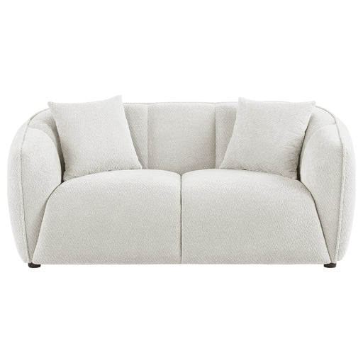 CoasterLoveseat with rounded shelter arms and textured chenille upholstery adds cozy two-seat comfort to living rooms and dens. Vertical channel detailing...