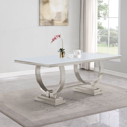 CoasterThis modern dining table makes a bold statement with its sleek tempered glass top and sculptural stainless steel base. Designed for both elegance a...
