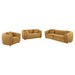 Three-piece sofa set creates a coordinated living room arrangement with sofa, loveseat, and accent chair wrapped in textured chenille upholstery. Rounded shelter arms and vertical channel detailing keep the silhouette sculpted and contemporary while plush seat cushions invite everyday relaxation. A wood and plywood frame supports foam and polyester fiber cushioning for durability, and dark brown legs add subtle lift and contrast to the warm mustard chenille upholstery.