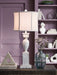This table lamp takes a classic approach to tasteful lighting. Its detailed base ushers an air of elegance into your space with a graceful turn design. Outfitted with an antiqued white finish, it's right at home in traditional spaces. Pair with the matching floor lamp (sold separately) for double the style.