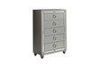 The Riley puts a contemporary spin on old-world style. The luxurious silver finish and mirror accents add sleek, ultramodern touches, while a tufted headboard and footboard echo the traditional style of upscale, craftsman made furniture.