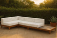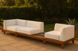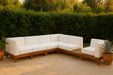 Build the seating group you need for your outdoor entertaining area with one or more selections from the Rio collection including this Rio outdoor water resistant modular sectional. A solid acacia wood frame provides sturdy dependability for this sectional, ensuring its long-lasting performance and impeccable beauty. The plump cushions are encased in resilient water resistant fabric to keep them looking luxuriously beautiful for seasons to come. Attach other units in the collection to this sectional with convenient latches.