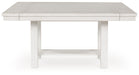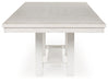Details Made with rubberwood solids, ash veneer and MDF substrates, Antiqued white finish with grain texture, Tabletop with planked effect, Two 12" removable center leaves, Table extends to 86" overall by pulling both ends and dropping in leaves, Seats up to 8, Assembly required