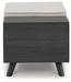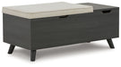 Details Made with engineered wood and decorative laminate, Replicated blackened wood finish with grayed textural grain, 2 hidden storage compartments, Linen-look polyester foam cushion, Removable seat cushion and tops, Tapered legs, Assembly required